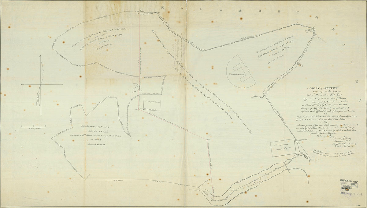 Joseph Smith wrote Comm. J. D. Sloat on December 3, 1850; “Herewith you will receive the plans for the Magazine to be erected at Fort Norfolk which have been repaired by Mr. Parris, the Engineer of the Navy Yard Portsmouth N. H.. The working plans will be forwarded to you as soon as they can be prepared.” Soon afterwards on December 26, 1850, the working plans of the Magazine to be built at Fort Norfolk were sent to Comm. Sloat.
