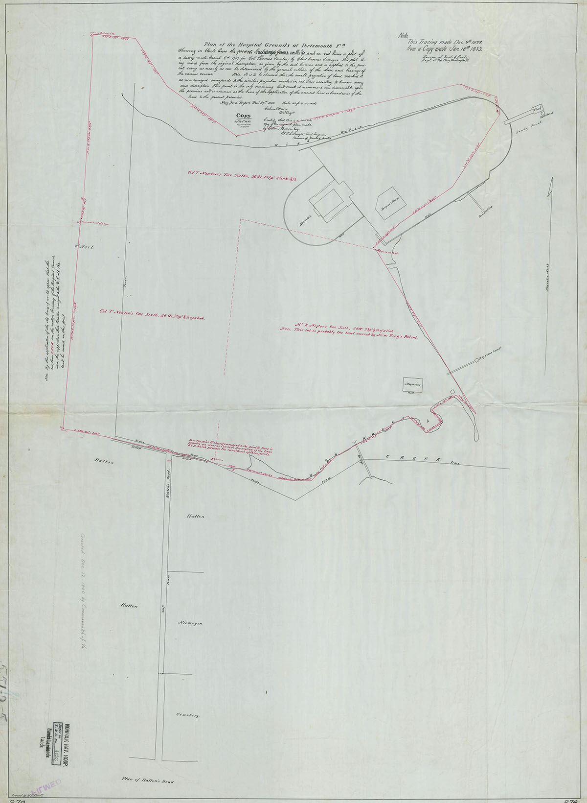 Commodore Joseph Smith, Chief of the Burrow of Yards & Docks, wrote Captain Samuel L. Breese, Commandant Navy Yard Gosport, on February 25, 1853 to ask why surveys of Mr. E. L. Young the County Surveyor, 21st October 1850, and Engineer Calvin Brown, dated 27th December 1852 were so different. Calvin Brown, Civil Engineer, Navy Yard Gosport wrote a detailed explanation on March 4, 1853. The Calvin Brown survey is considered more accurate and clearly shows the location of the old Navy Magazine on the Hospital Grounds. (see above)